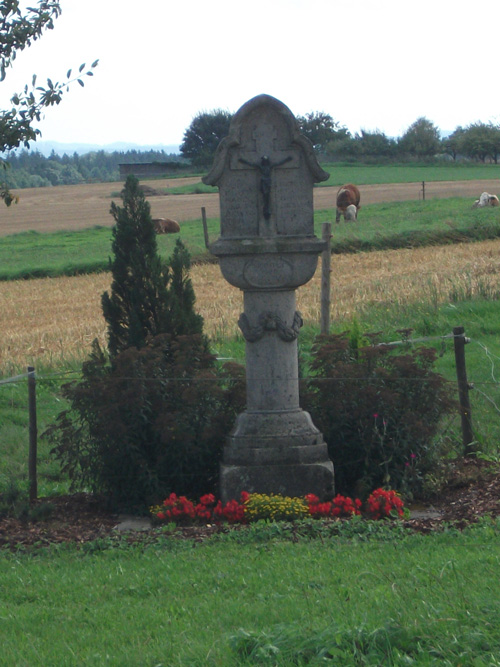 Blumenanpflanzung, guter Zustand, Korpus (4 Ngt.) an erhabenem Steinkreuz, steinerne Pflanzengirlande um den Sockel (Ackerfrüchte?), Dach in spitzer Kleeblattbogenform